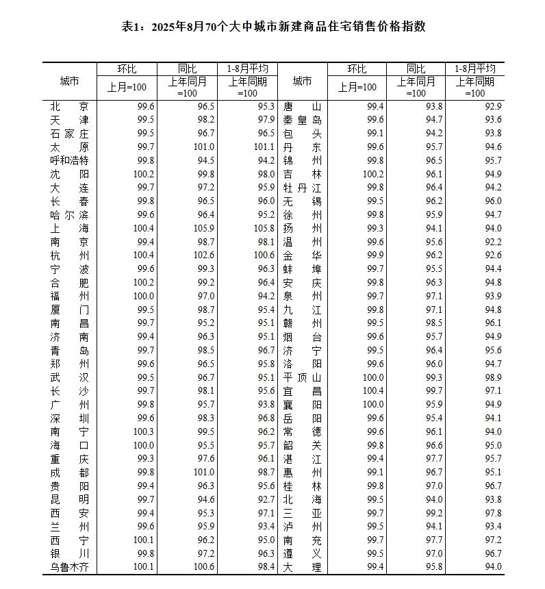 表1:2025年8月70个大中城市新建商品住宅销售价格指数