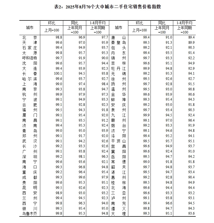 表2:2025年8月70个大中城市二手住宅销售价格指数