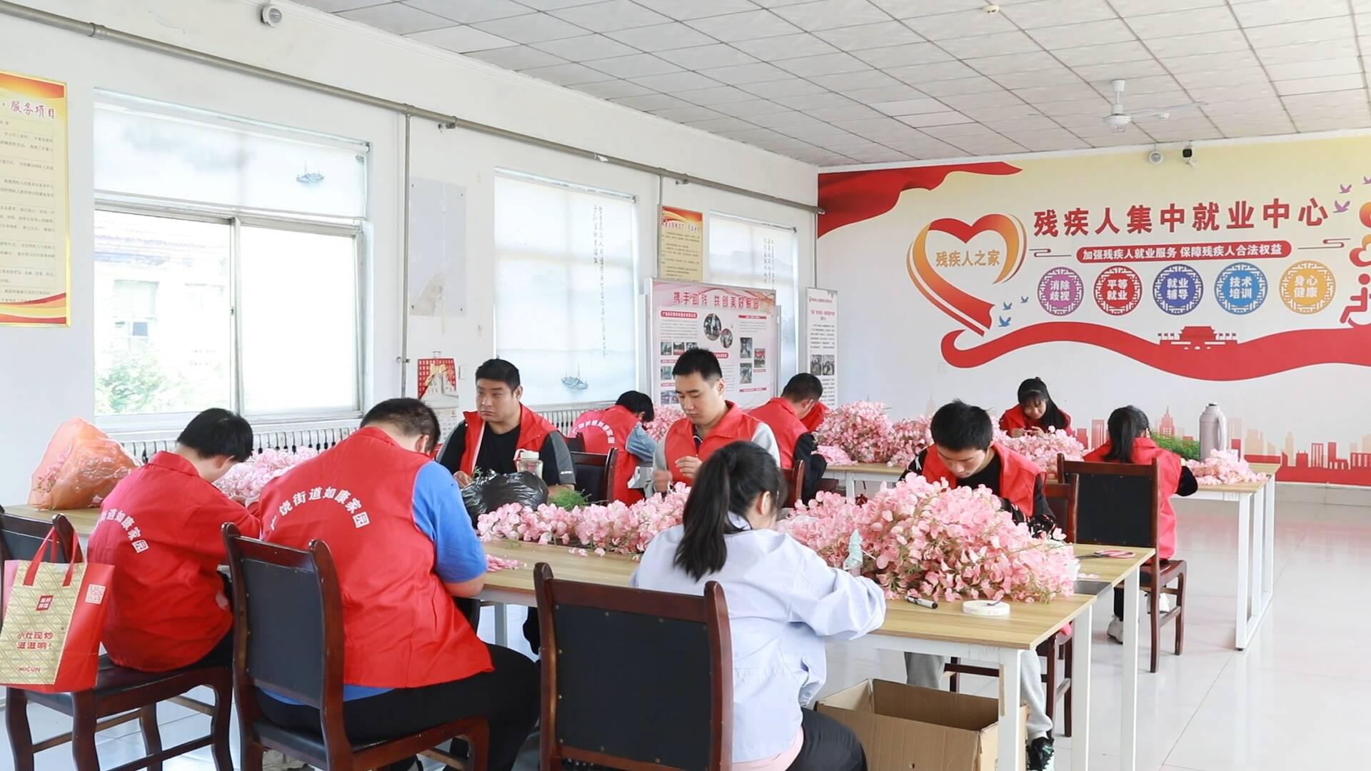 在广饶县“如康家园”按比例集中就业中心,14名残疾就业人员正做着手工插花,修剪、搭配、塑形,原本零散的花材在他们手中变成了一簇簇精致的艺术品。