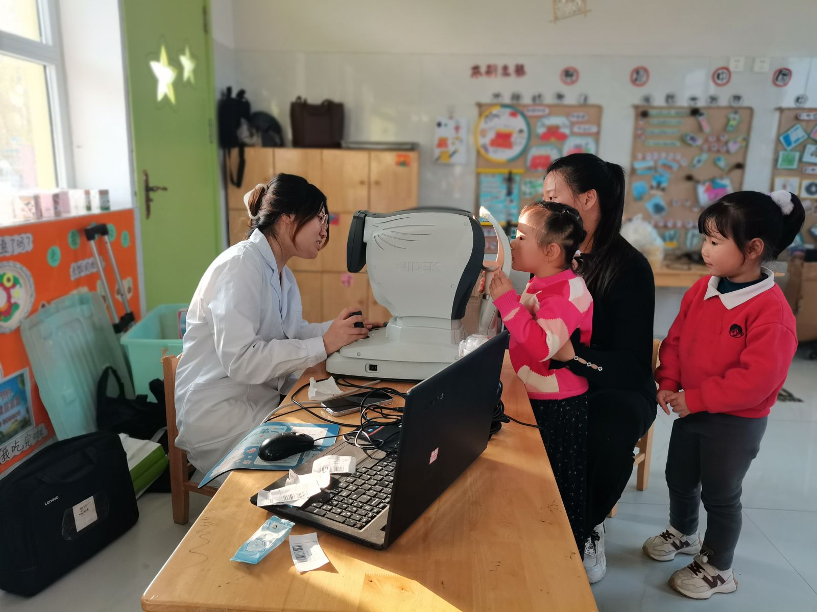 本次查体实现“生理+心理”双重监测,涵盖视力、口腔、耳鼻喉常规检查及幼儿心理行为观察。活动现场,医护人员耐心细致地为每位幼儿进行专业检查,借助便携式设备评估幼儿屈光状态、排查龋齿以及耳鼻喉隐患,还通过趣味游戏、亲切问答的互动方式对幼儿的行为和心理进行观察和分析,全体教师与医护人员高效配合,活动氛围轻松有序。