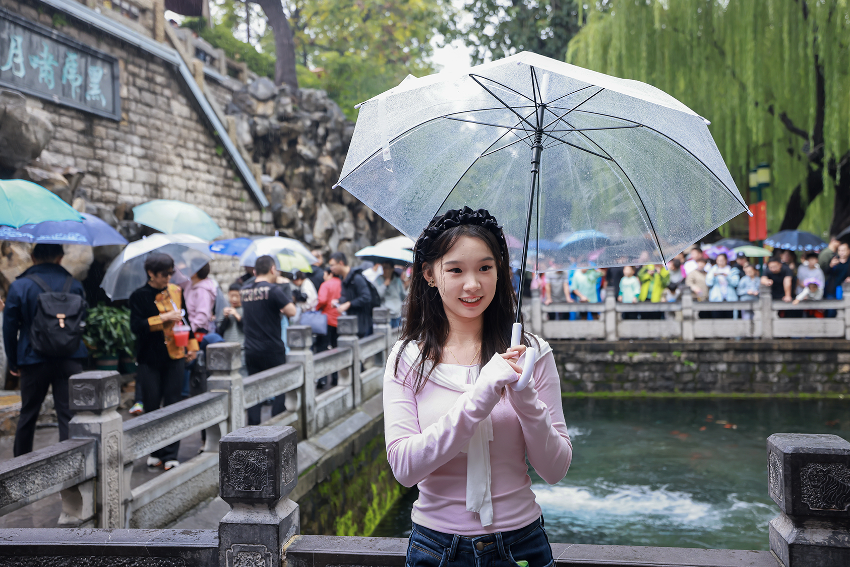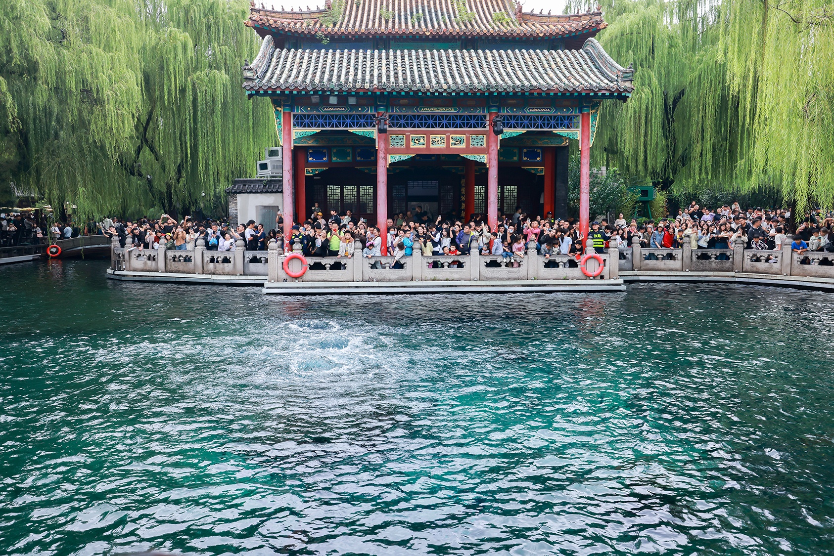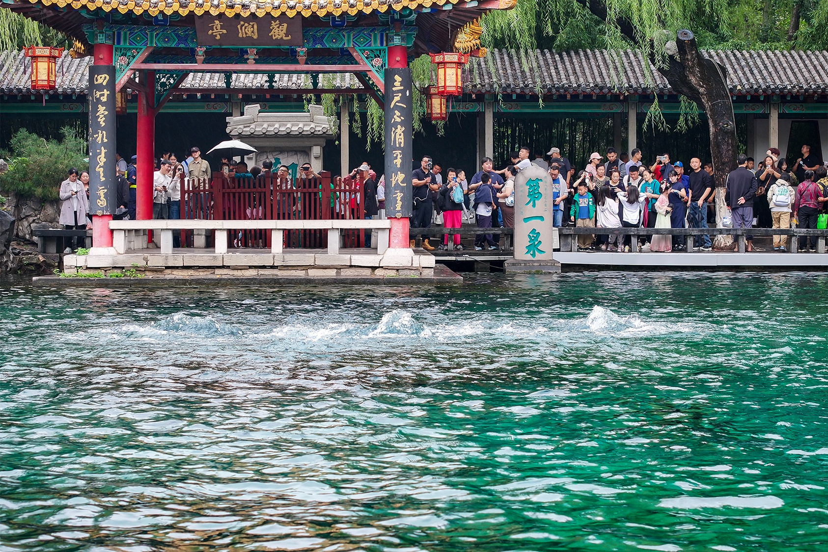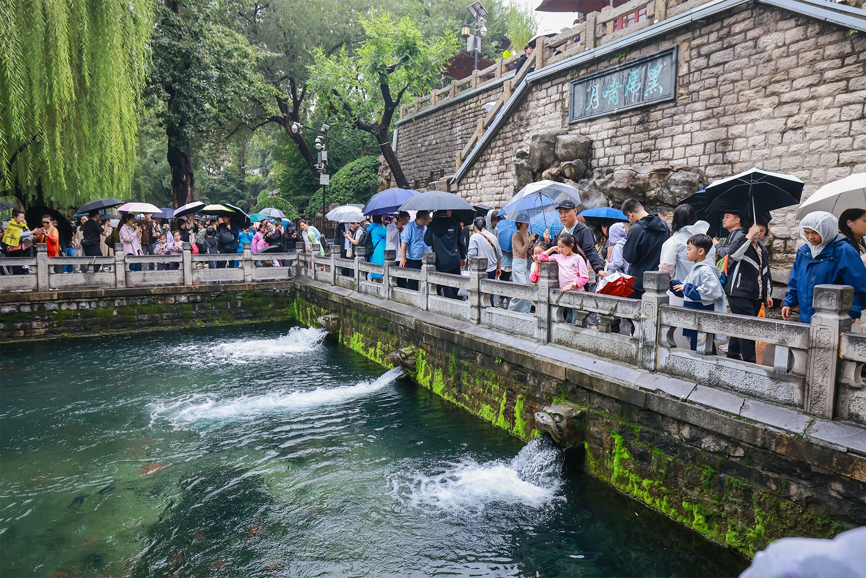 今日(10月6日)的阴雨天并没有影响游人们赏泉的兴致,看“趵突撒欢”,听“黑虎啸吼”,观“月牙飞瀑”,别有意境,感受到中秋节泉边的生动和美妙。