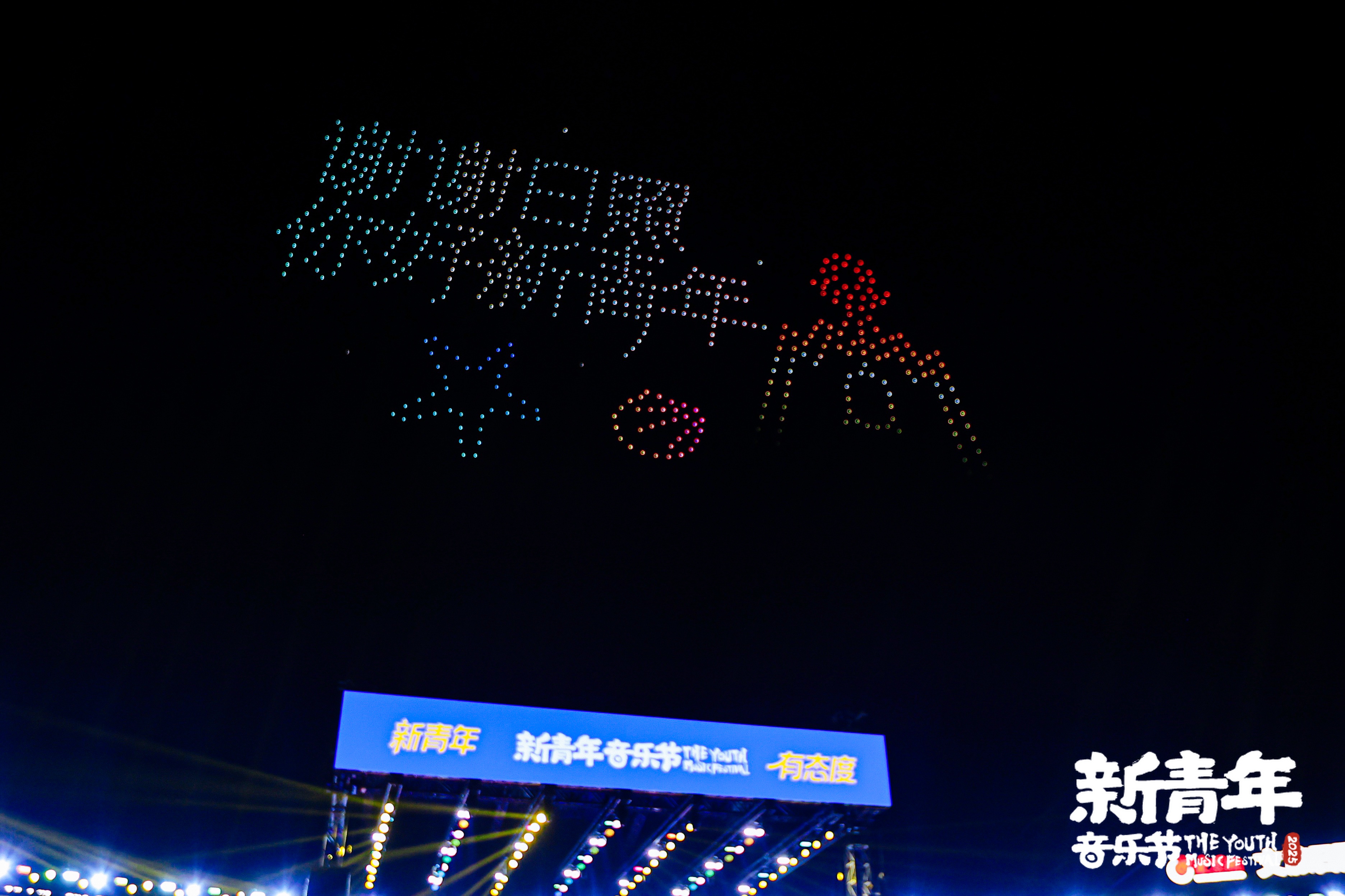 而于23时左右开启的无人机烟花秀则赢得全场欢呼,“感谢你,奔赴这珍贵的约定”“此刻的你,勇敢且浪漫”等字句被紧密排列变换的无人机队挂上夜空时,IP化的音乐节与乐迷实现对话,情感联结延续了IP的生命。
