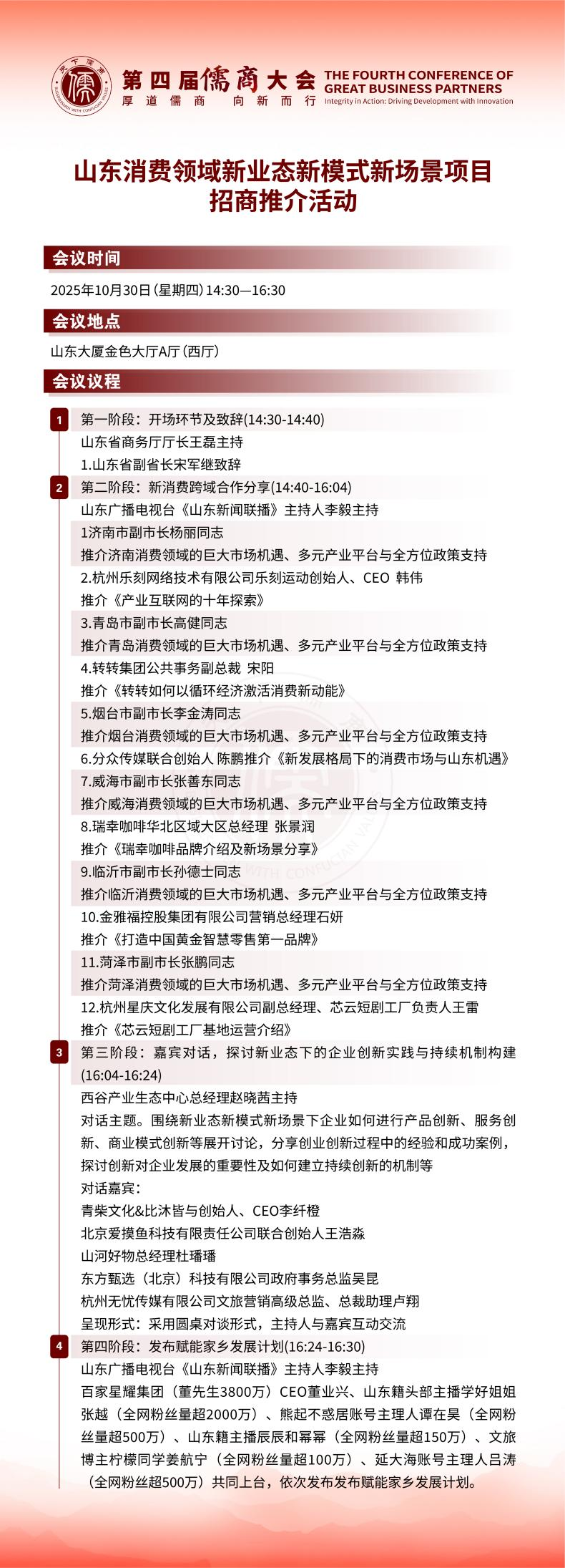 2025年10月30日14:30,山东消费领域新业态新模式新场景项目招商推介活动将在山东大厦金色大厅A 厅(西厅)举行。