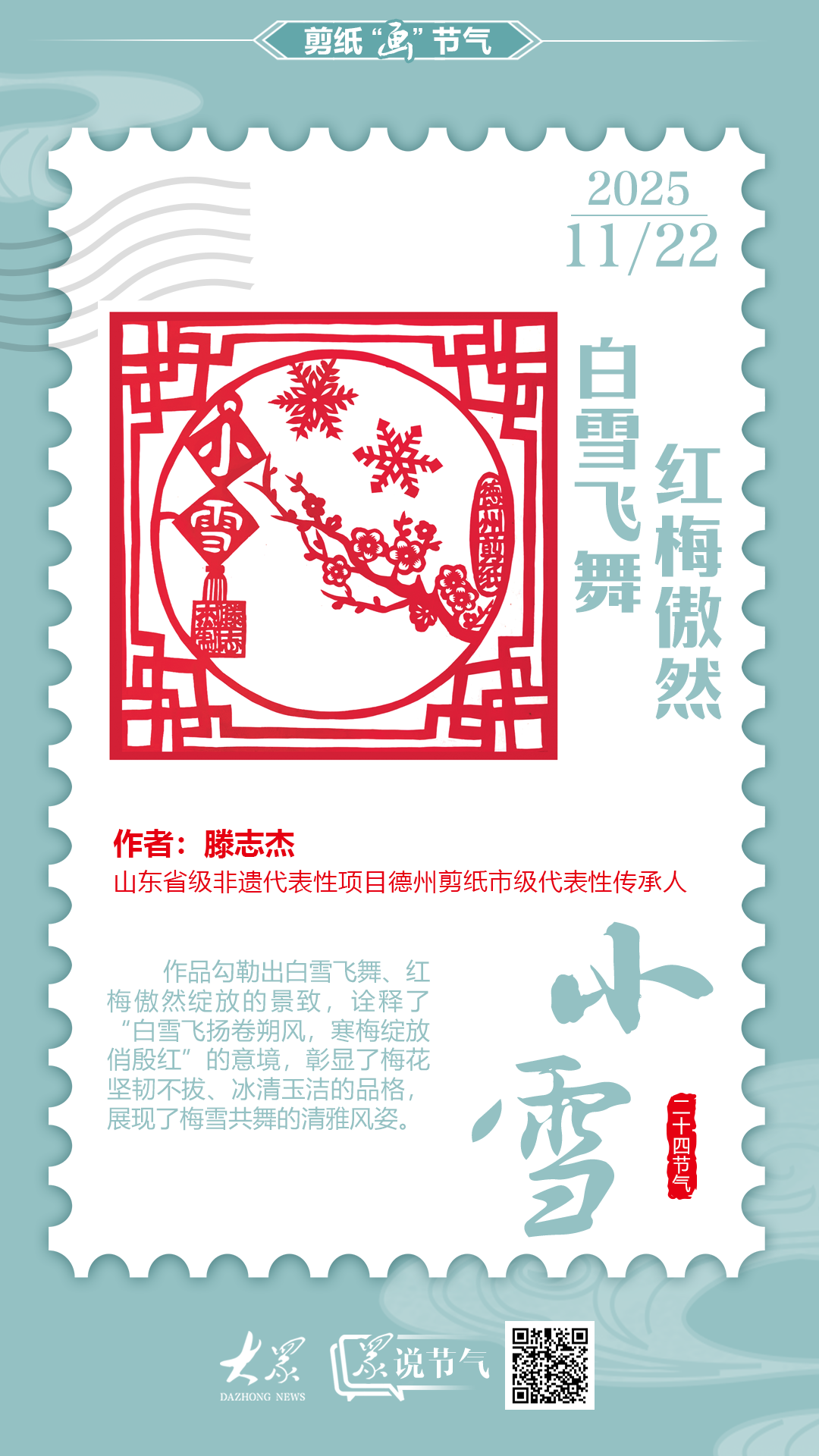 作品简介:作品勾勒出白雪飞舞、红梅傲然绽放的景致,诠释了“白雪飞扬卷朔风,寒梅绽放俏殷红”的意境,彰显了梅花坚韧不拔、冰清玉洁的品格,展现了梅雪共舞的清雅风姿。小雪节气标志着冬季的深入,承载“瑞雪兆丰年”的美好寓意,寄托着人们对五谷丰登的殷切期盼;而梅花五瓣分别象征“福、禄、寿、喜、财”,为作品增添了吉祥美好的文化内涵。