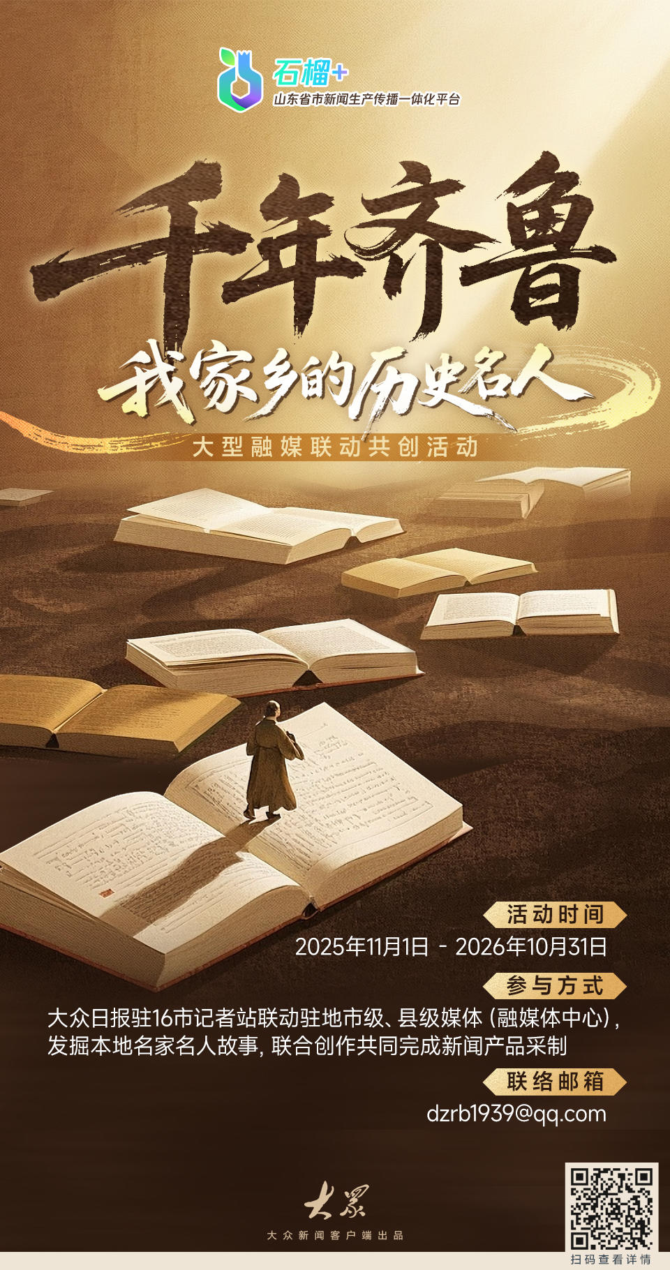 产品由大众日报各地记者站与地方媒体联合共创,双方共同确认产品无误后以邮件方式报送。报送时,请在标题处注明“千年齐鲁”前缀字样,并注明联合共创单位、作者、联系方式等信息。