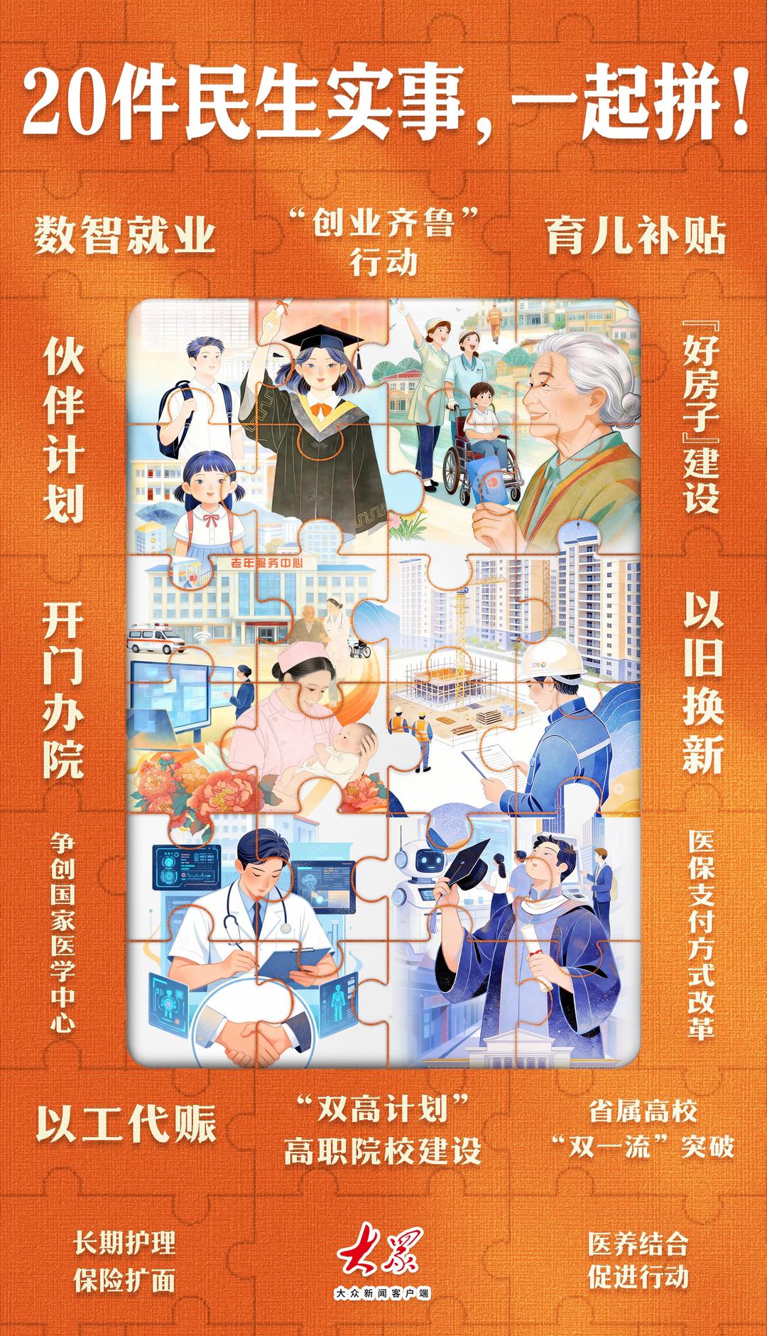 1月27日上午,山东省第十四届人民代表大会第四次会议在济南开幕,省长周乃翔作政府工作报告。报告指出,要奋力推进保障和改善民生。坚持尽力而为、量力而行,更加注重投资于物和投资于人协同发力,扎实办好20项重点民生实事。就业、教育、医疗、住房、养老……您的期待,正在“拼”成答案!