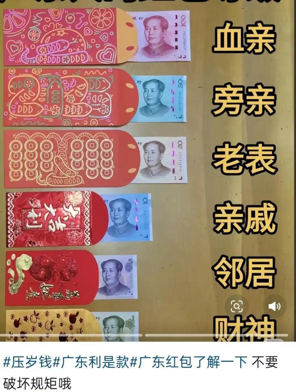 最近,一张标注“血亲100元、旁亲50元、老表20元、亲戚10元、邻居5元、拜神2元”的广东红包金额参考图,在社交平台上走红。此前,广东佛山一对新人结婚,将亲友送上的红包轻轻折角后退还,表示“祝福已收下”,同样引发网友一片点赞。
