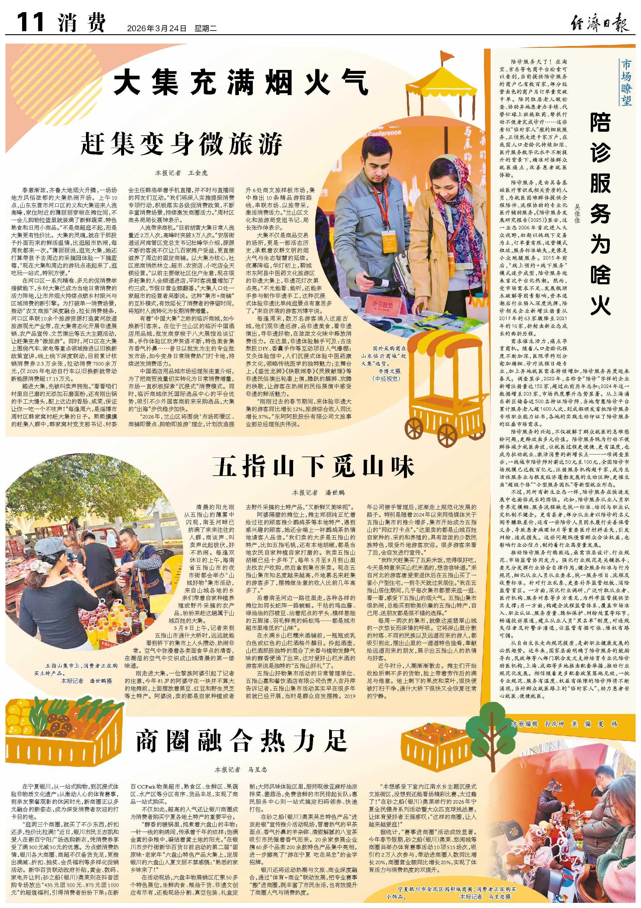踏进大集,先被叫卖声拥抱。“看看咱们村里自己磨的无添加石磨面粉,还有刚出锅的手工大馒头,配上这边的香肠、咸菜,保证让你一吃一个不吱声!”每逢周六,是淄博市周村区韩家窝村赶大集的日子。熙熙攘攘的赶集人群中,韩家窝村党支部书记、村委会主任韩浩举着手机直播,并不时与直播间的网友们互动。“我们将深入实施提振消费专项行动,积极落实各级促消费政策,不断丰富消费场景,持续激发商圈活力。”周村区商务局局长聂坤表示。