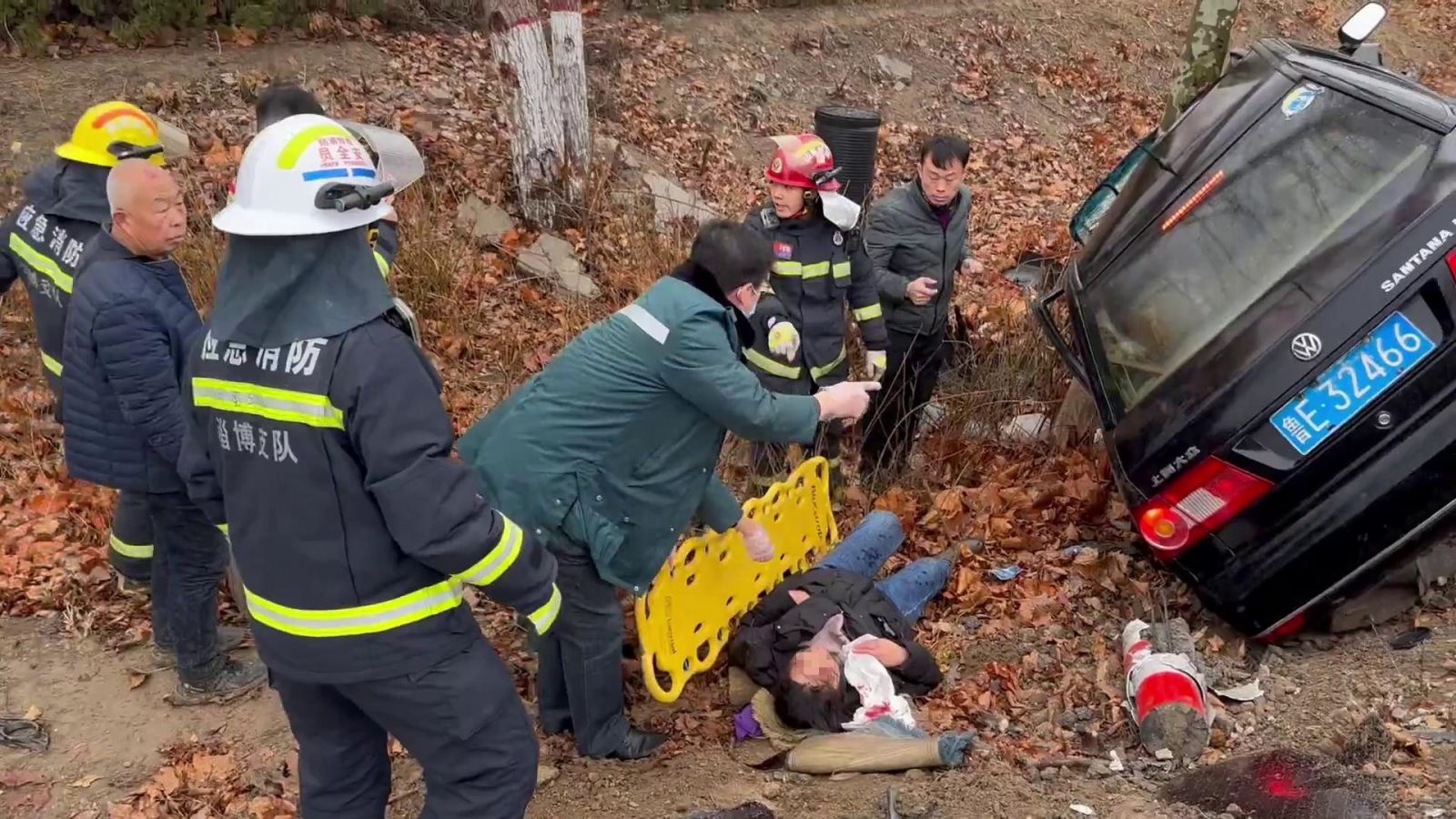 消防救援人员到达现场后经询问得知,两辆轿车发生碰撞,其中有一辆车侧翻掉入沟内,驾驶员为40岁左右女性,已被甩出车外伤势较为严重,驾驶室后方有一名60岁左右女性老人被困车内,消防救援人员现场积极磋商救援方案并快速展开救援。