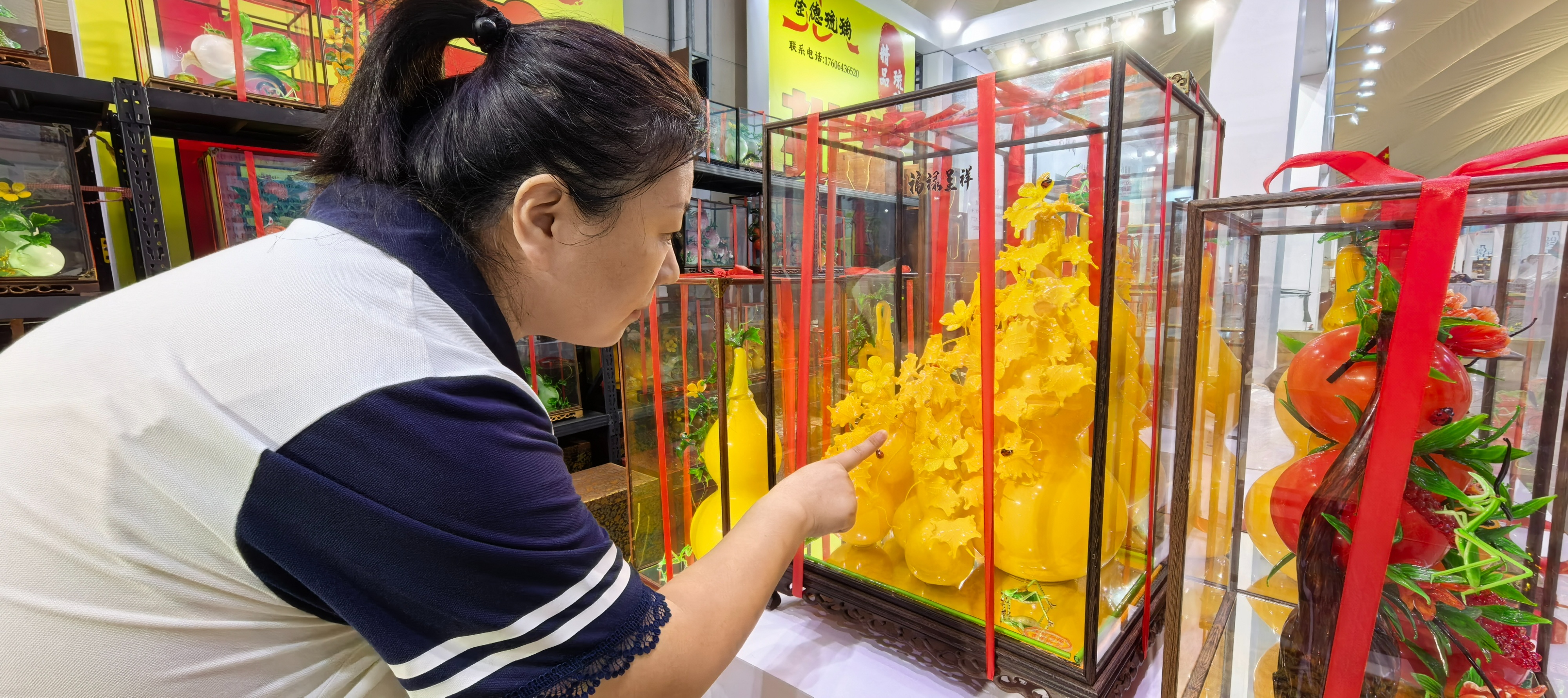 B馆内的布展同样热火朝天。刚迈进馆内,一组“蹴鞠+水果”元素的作品就引起了记者的注意。淄博市淄川振华玻璃制品有限公司总经理陈京田介绍,该作品以六片蹴鞠为底座,六个面分别手绘了淄博的标志性文化元素,上面则为热塑琉璃水果做的大果篮,有丰收寓意。公司展位分工艺进行布展,将展出热塑、雕刻、内画、古法琉璃等上千种产品,70%都为新品。陈京田说:“我们已经连续11年参加陶琉会,对于宣传品牌起到了很大作用,也取得了很不错的经济效益。”