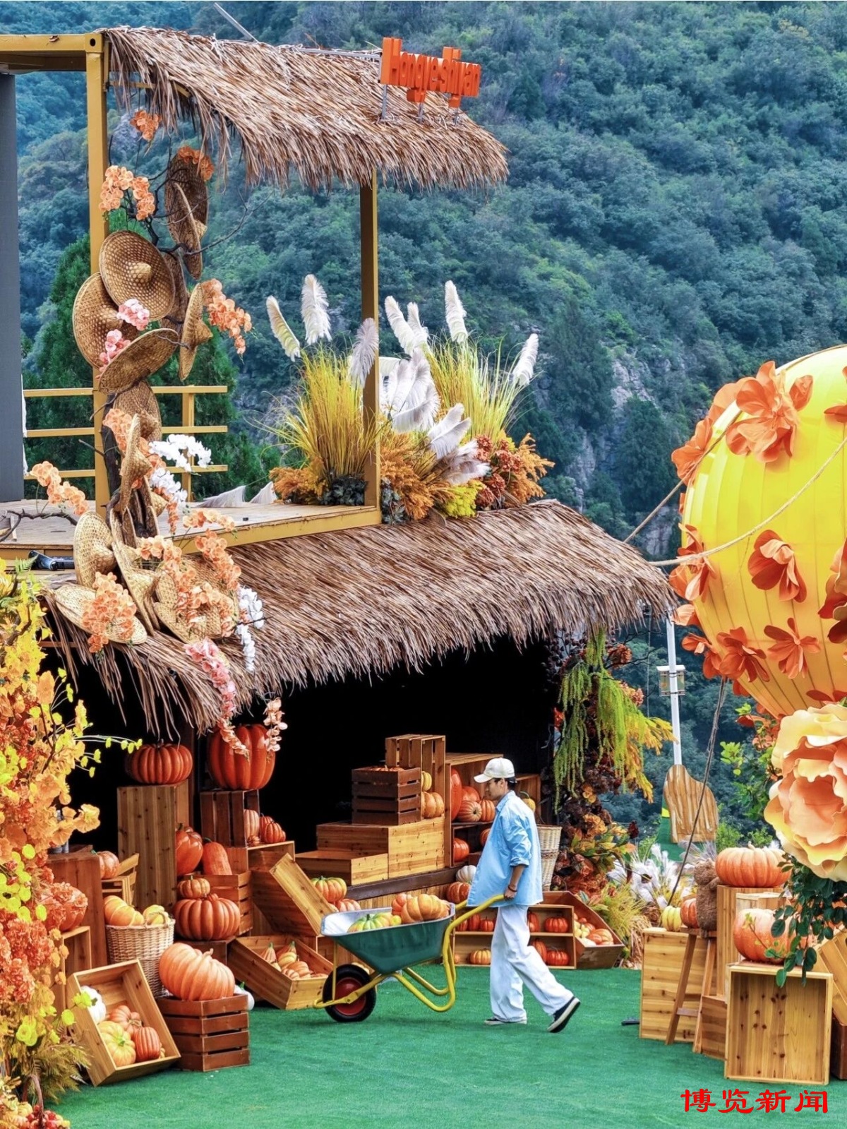 山巅之上的“云上的秋”主题乐园巧妙融合大型艺术装置与自然秋色,枫叶秋千、秋日风车、黄金谷物点缀其间,漫步如入云端仙境。南瓜奇境谷中,巨型南瓜与金色谷穗开启橙黄童话世界。柿岩古村内,浓郁的“田园晒秋风”扑面而来,辣椒赤、玉米黄、南瓜橙等丰收果实随山势铺展,与石墙黑瓦相映成趣,宛如流动的《秋收图》。夜晚,《奇幻聊斋》大戏点亮夜空,为游客带来全方位的视听享受。