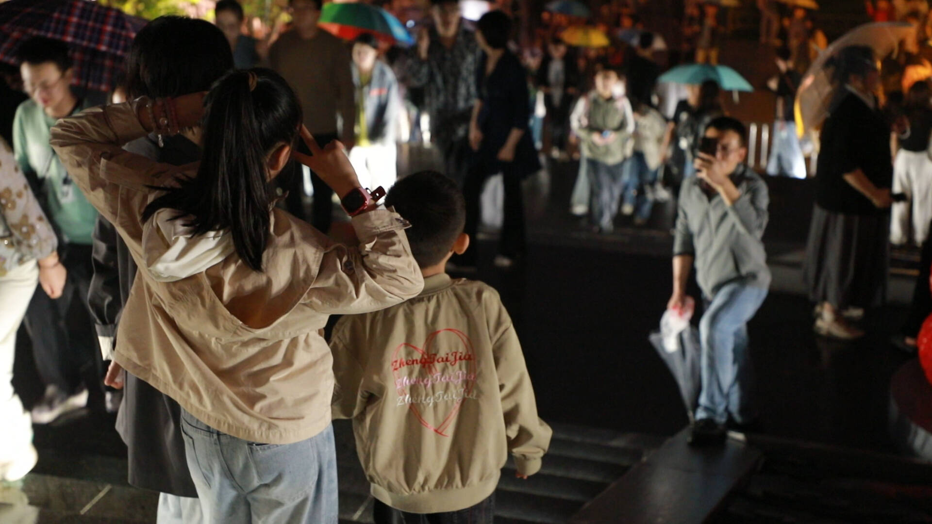 像她一样专程为夜景而来的游客不在少数。从潍坊专程赶来的李晓玥说:“我们上次来淄博是白天,错过了亮灯的时刻。所以这次特意来看夜晚的海岱楼,没想到碰上下雨,反而感觉更有了一番独特的韵味。”