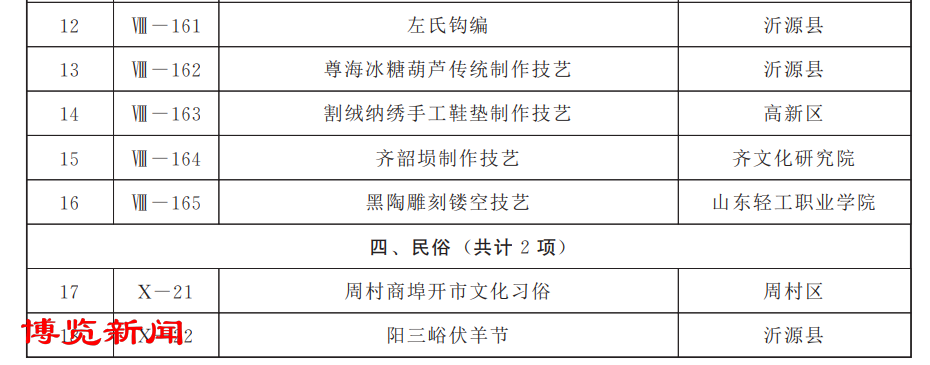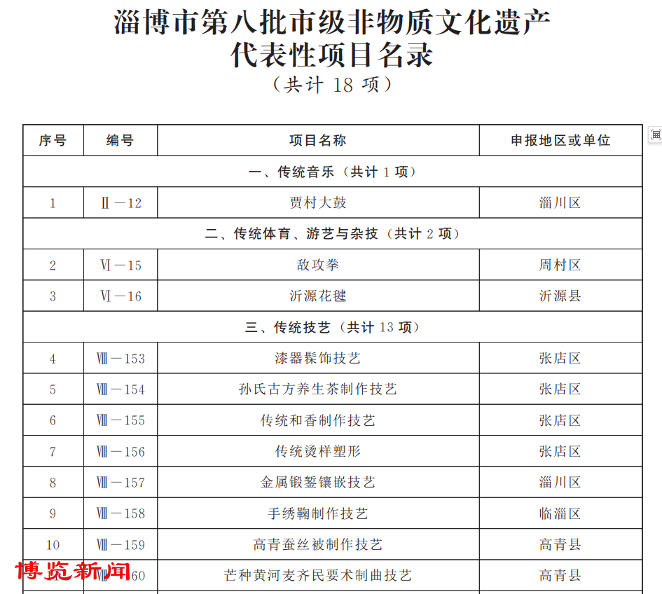 此次公布的名录中,第八批市级非遗代表性项目共18项,涵盖传统音乐、传统体育游艺与杂技、传统技艺、民俗四大类别。其中,贾村大鼓入选传统音乐类,敌攻拳、沂源花毽列入传统体育游艺与杂技类,漆器髹饰技艺、手绣鞠制作技艺等13项技艺归入传统技艺类,周村商埠开市文化习俗与阳三峪伏羊节则为民俗类新增项目。
