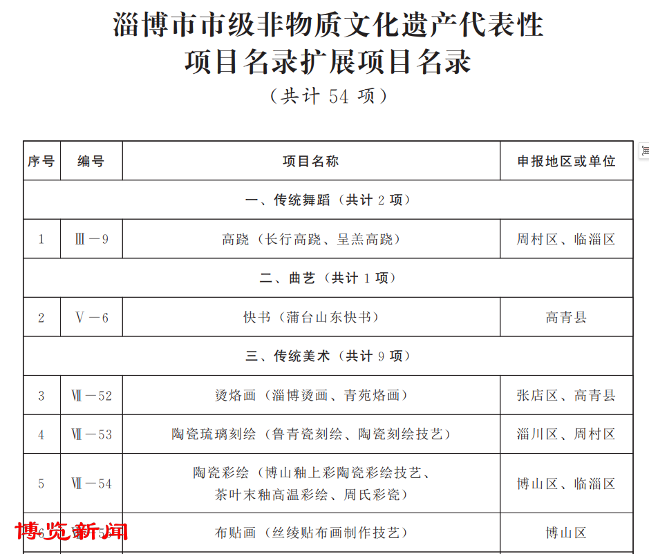 市级非遗代表性项目扩展名录收录54项,覆盖传统舞蹈、曲艺、传统美术、传统技艺、传统医药五大领域。高跷(长行高跷、呈羔高跷)、蒲台山东快书、烫烙画(淄博烫画、青苑烙画)、陶瓷琉璃刻绘等项目通过扩展申报入选,进一步丰富了已有非遗项目的传承体系。特别值得关注的是,传统技艺类扩展项目达33项,包含陶瓷烧制、琉璃制作、传统肉食烹饪等多个与市民生活密切相关的技艺;传统医药类也有9项中医诊疗法、正骨疗法及制剂方法入选。