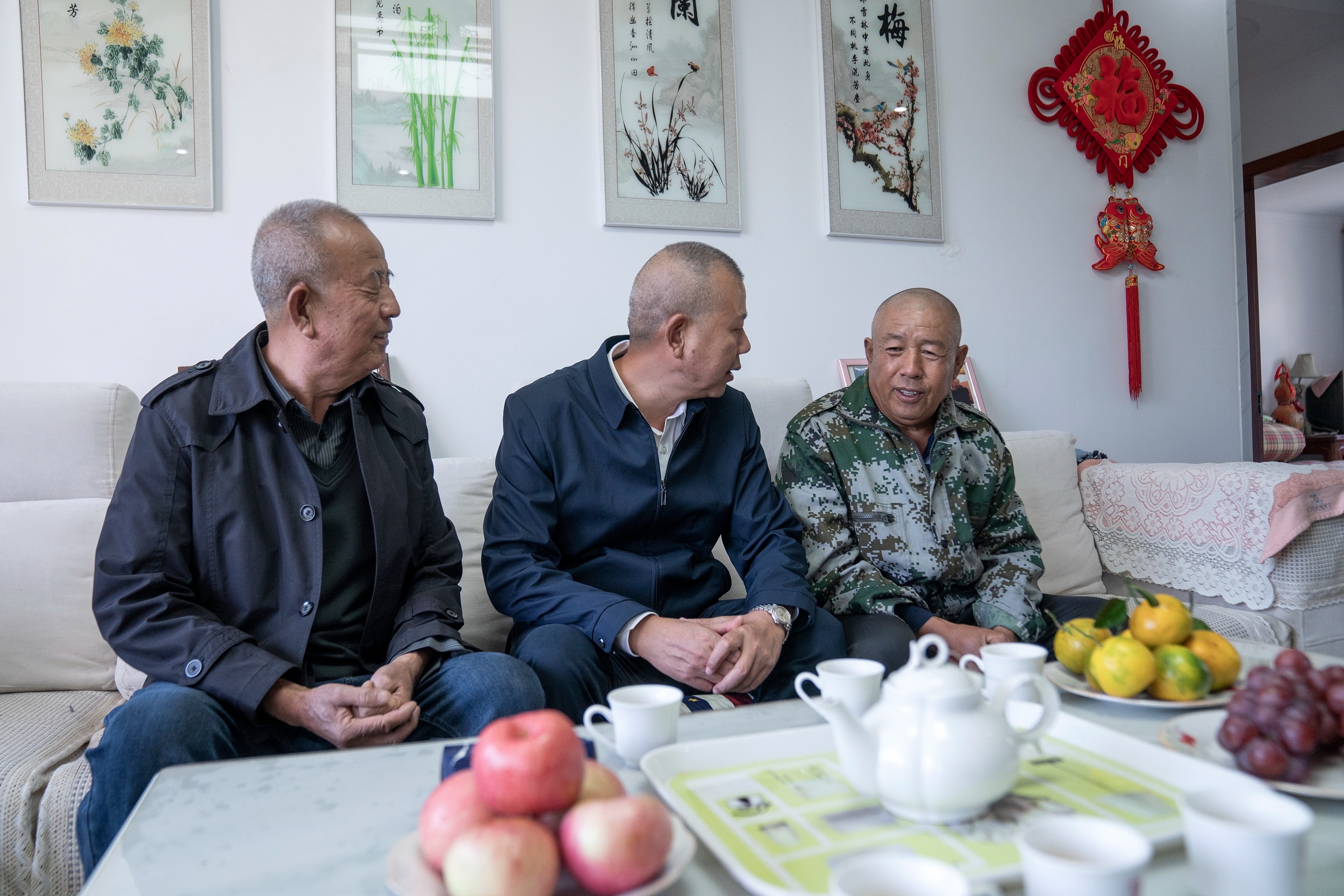 2025年10月14日下午,高青县木李镇龙湾社区,黄拥军(中)和李继德老人的大儿子李京林(左)和小儿子李京业在家中交谈。此行除了到坟前祭拜,“到家里坐坐”是黄拥军心心念念的事儿。