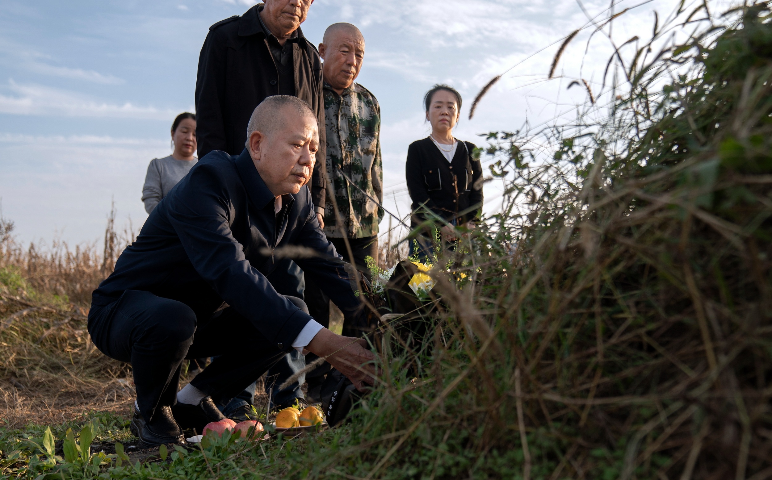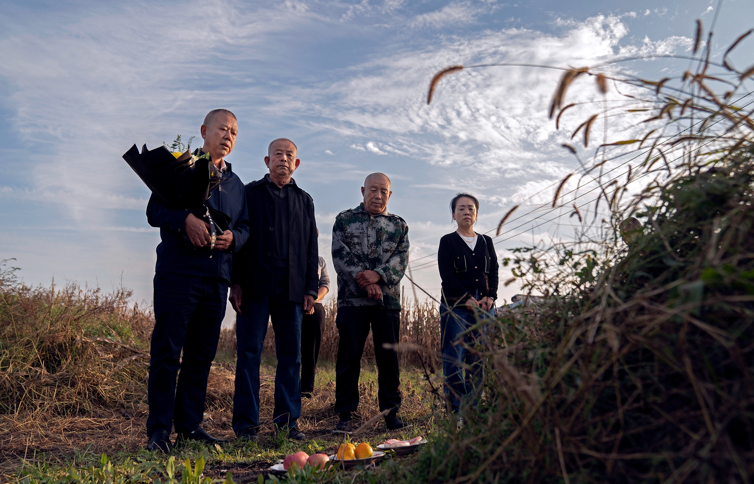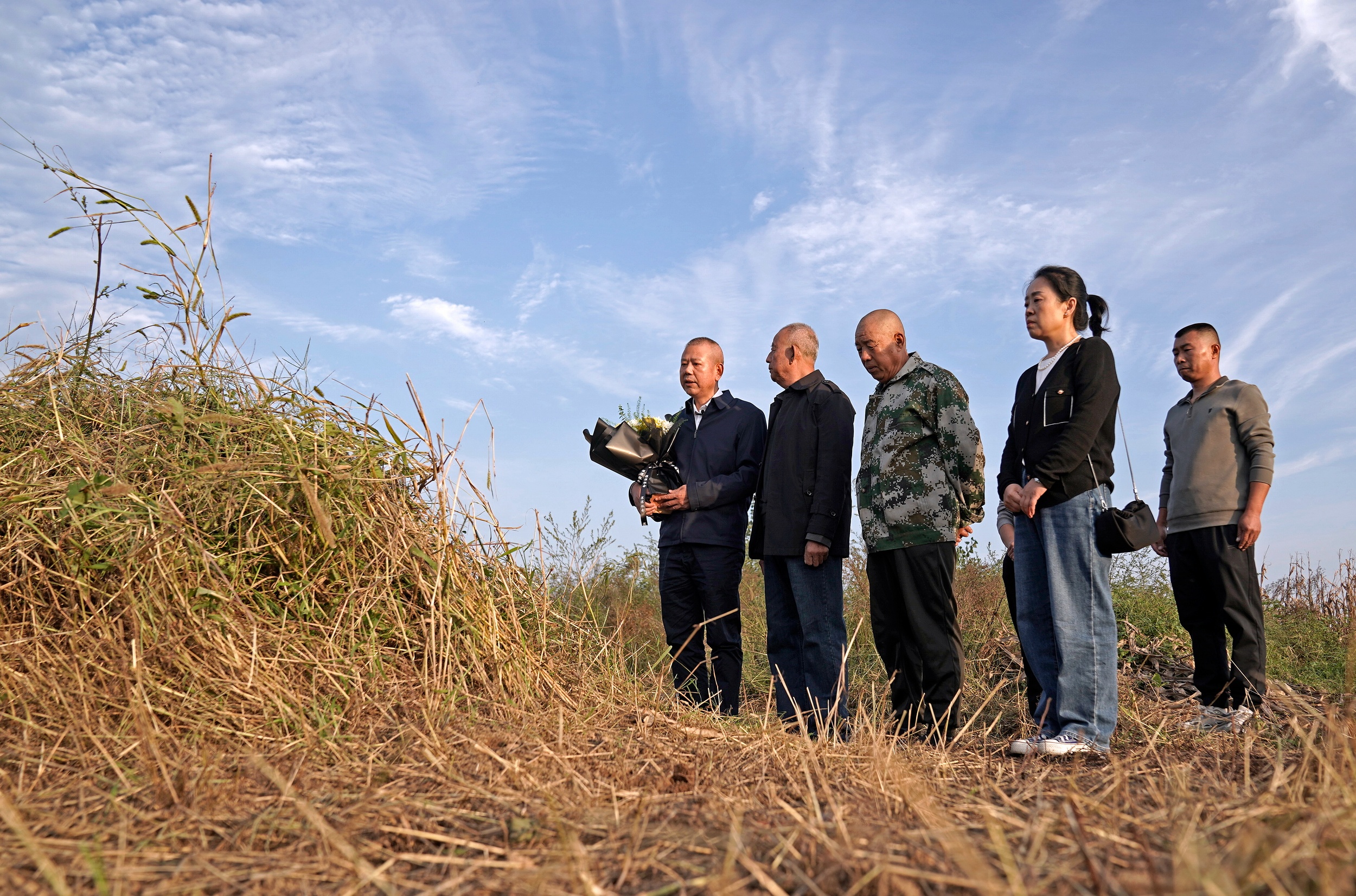 2025年10月14日下午,高青县木李镇三圣村公墓,黄拥军(左一)和妻子在李继德的大儿子李京林(左二)、小儿子李京业(左三)的陪同下,来到李继德老人的墓前祭拜。按照当地风俗,老人去世三年后才能整修坟墓并树立墓碑。由于李继德老人去世尚不满三年,因此老人的坟墓目前只是一个长满荒草的土堆。