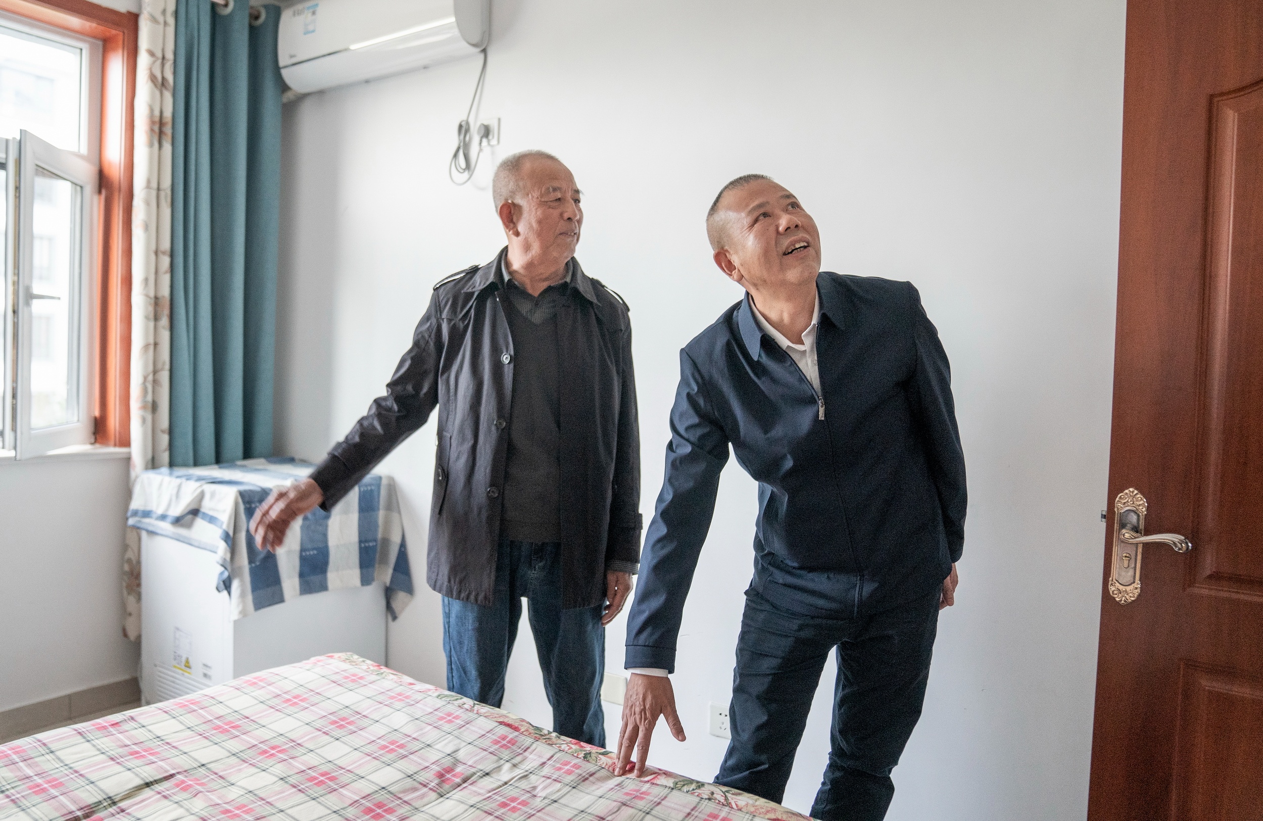 2025年10月14日下午,高青县木李镇龙湾社区,“这是我特意给你准备的房间,还想着你能多住几天……”李继德老人的大儿子李京林(左)带领黄拥军参观家里的房间。