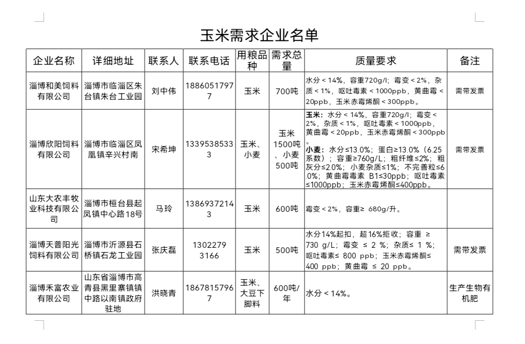 现正式公布相关企业信息,为售粮群众和企业搭建对接桥梁。有玉米出售需求的农户,或有收购需求的企业,可直接联系对接。