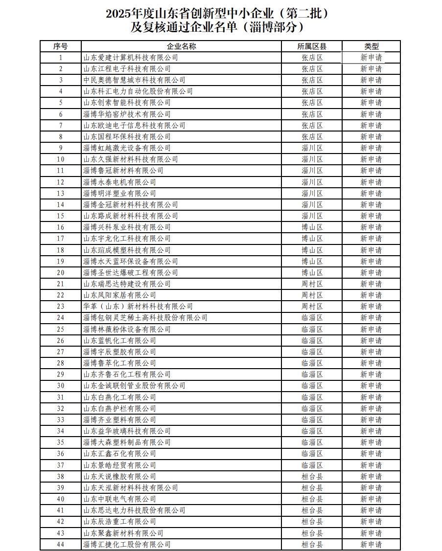 12月10日,淄博市工业和信息化局发布《关于公布2025年度山东省创新型中小企业(第二批)及复核通过企业名单(淄博部分)的通知》,淄博有105家新申请企业上榜,另有326家企业通过复核。
