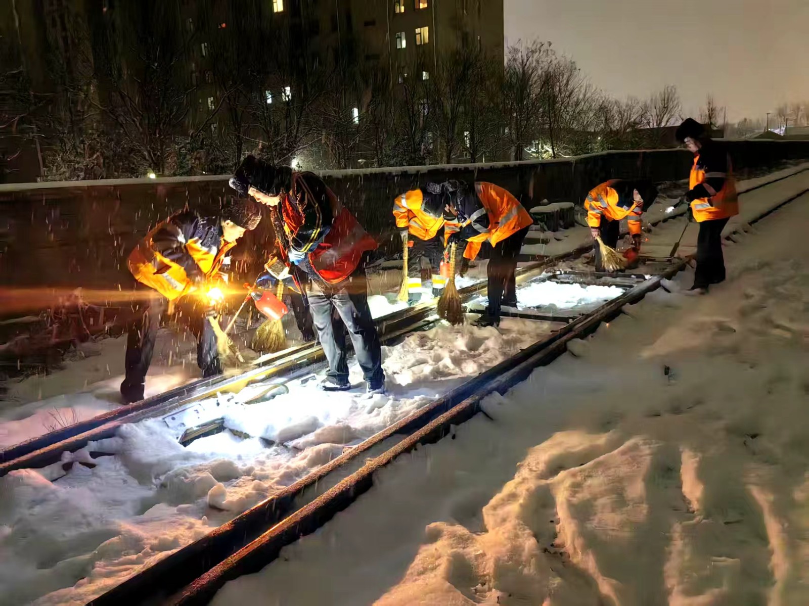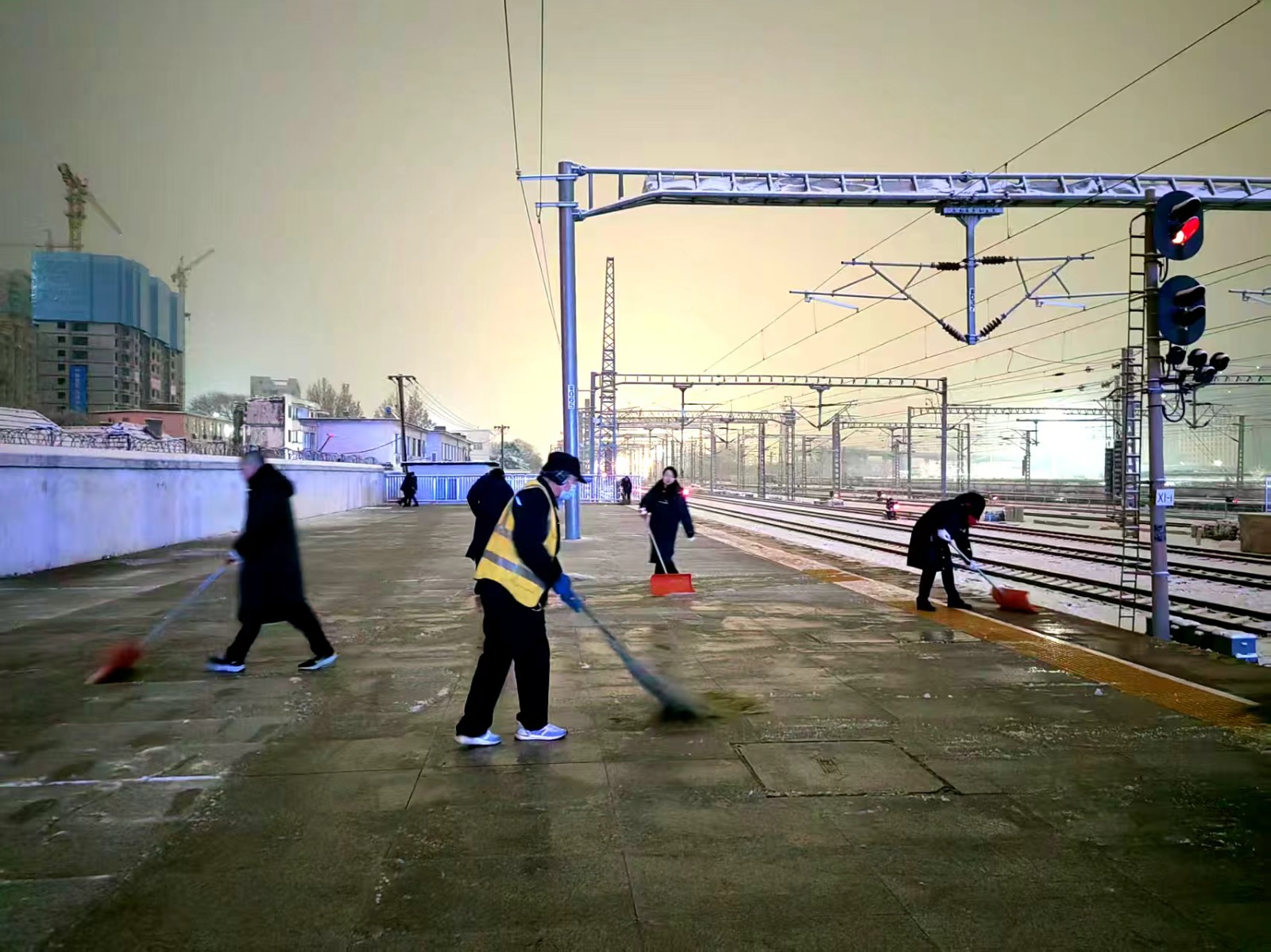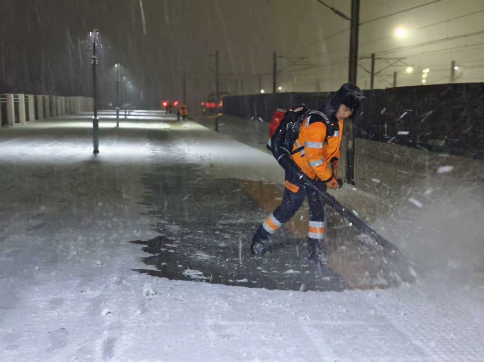 12月12日晚间,淄博车务段管内出现小到中雪天气。各车站迅速响应,工作人员按预案提前到岗,根据降雪情况,连夜对线路咽喉道岔区开展积雪清扫作业,并同步喷涂防冻液,防范道岔结冰影响行车。各客运站同步行动,及时清理进出站通道及站台积雪,铺设防滑设施、设置安全提示,保障列车运行秩序及旅客出行安全。