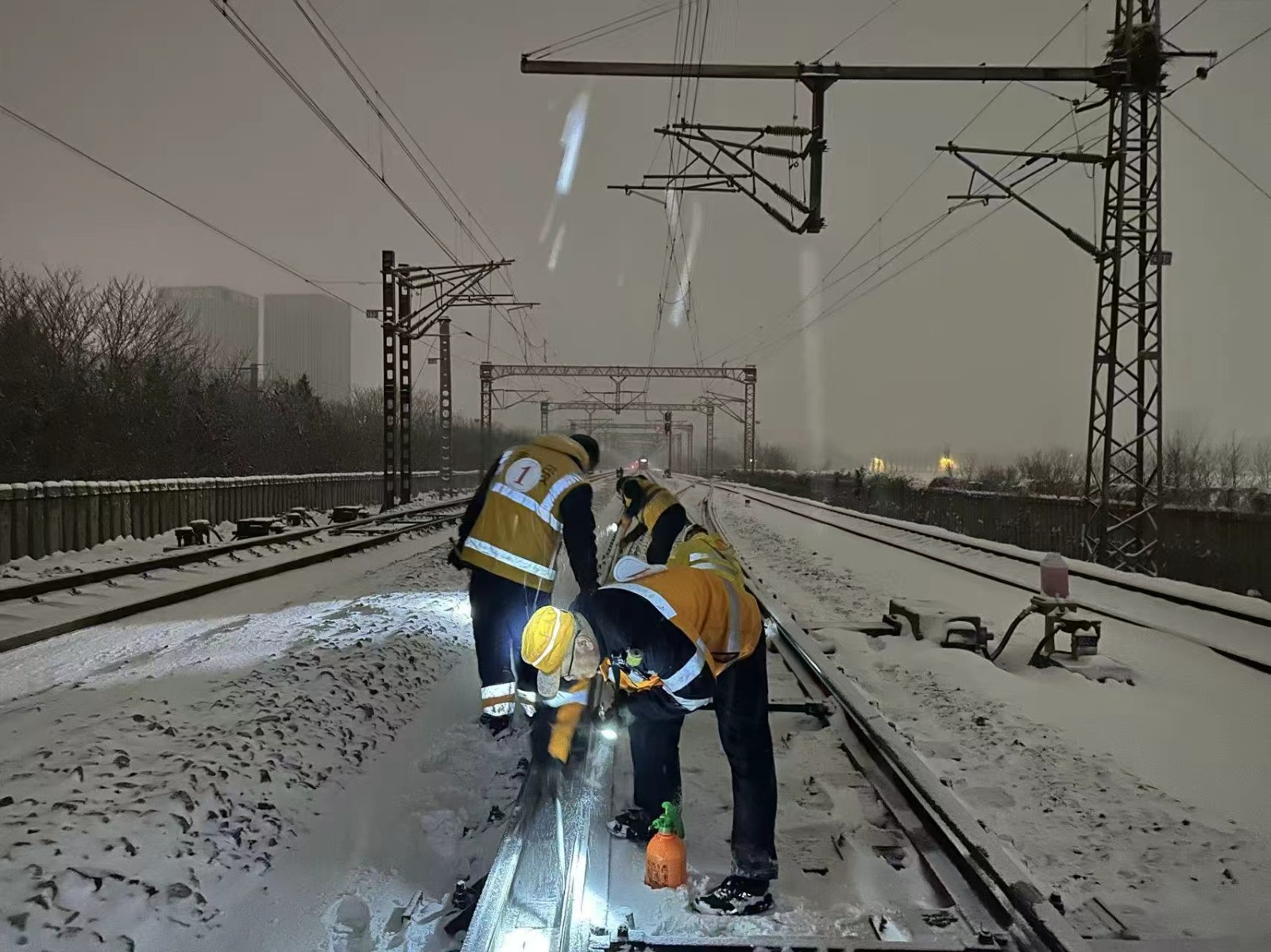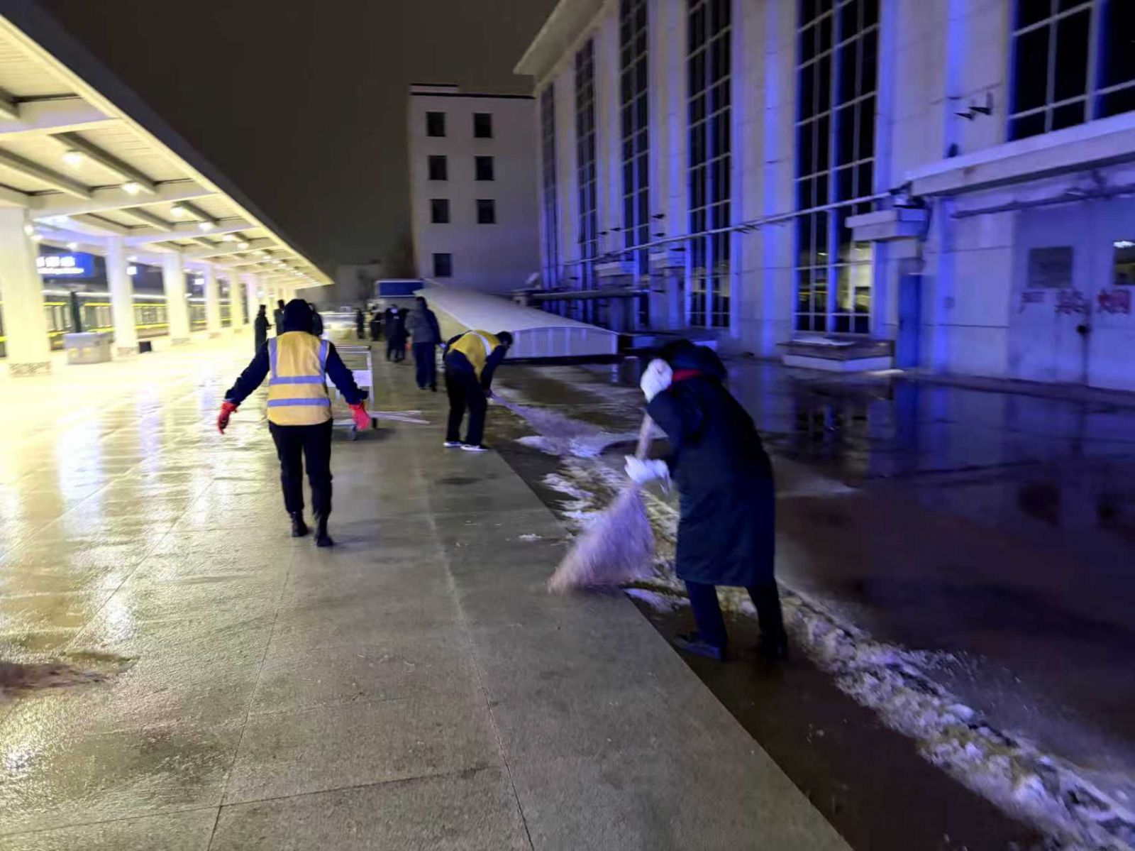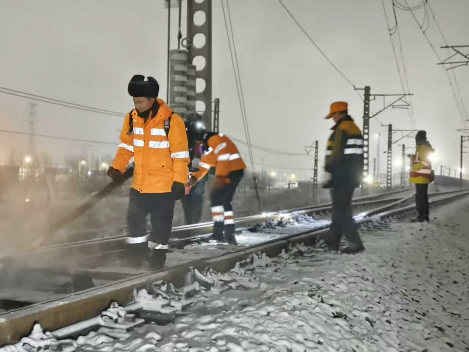 12月12日晚间,淄博车务段管内出现小到中雪天气。各车站迅速响应,工作人员按预案提前到岗,根据降雪情况,连夜对线路咽喉道岔区开展积雪清扫作业,并同步喷涂防冻液,防范道岔结冰影响行车。各客运站同步行动,及时清理进出站通道及站台积雪,铺设防滑设施、设置安全提示,保障列车运行秩序及旅客出行安全。