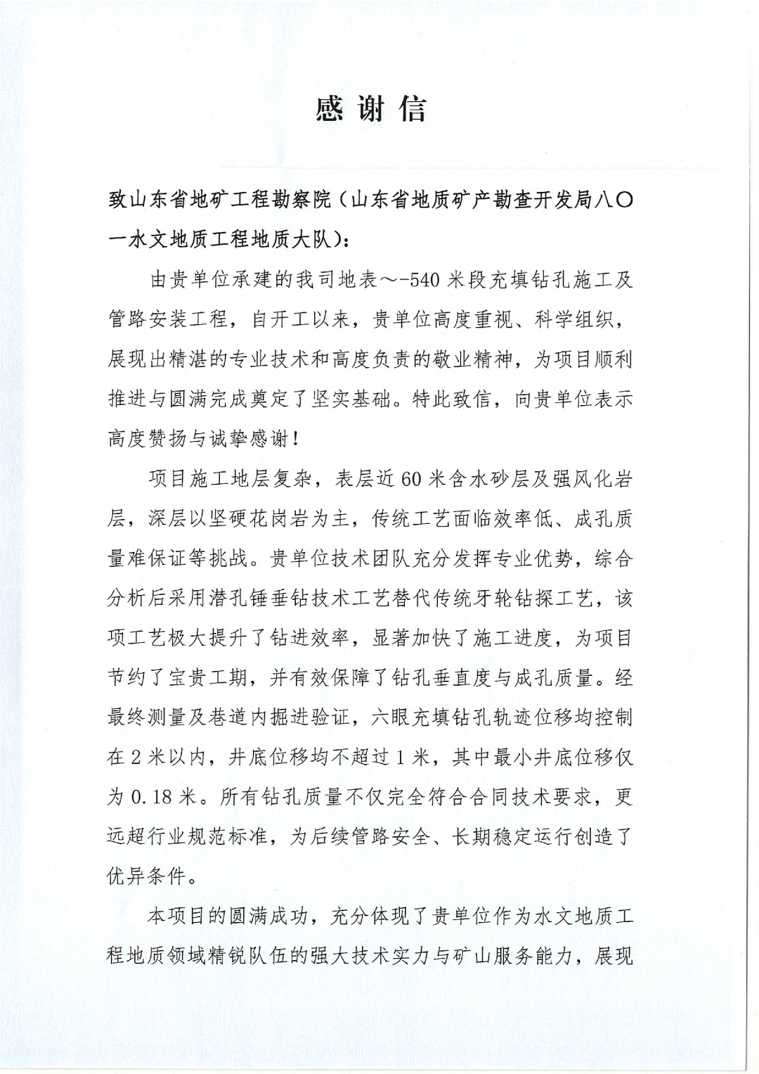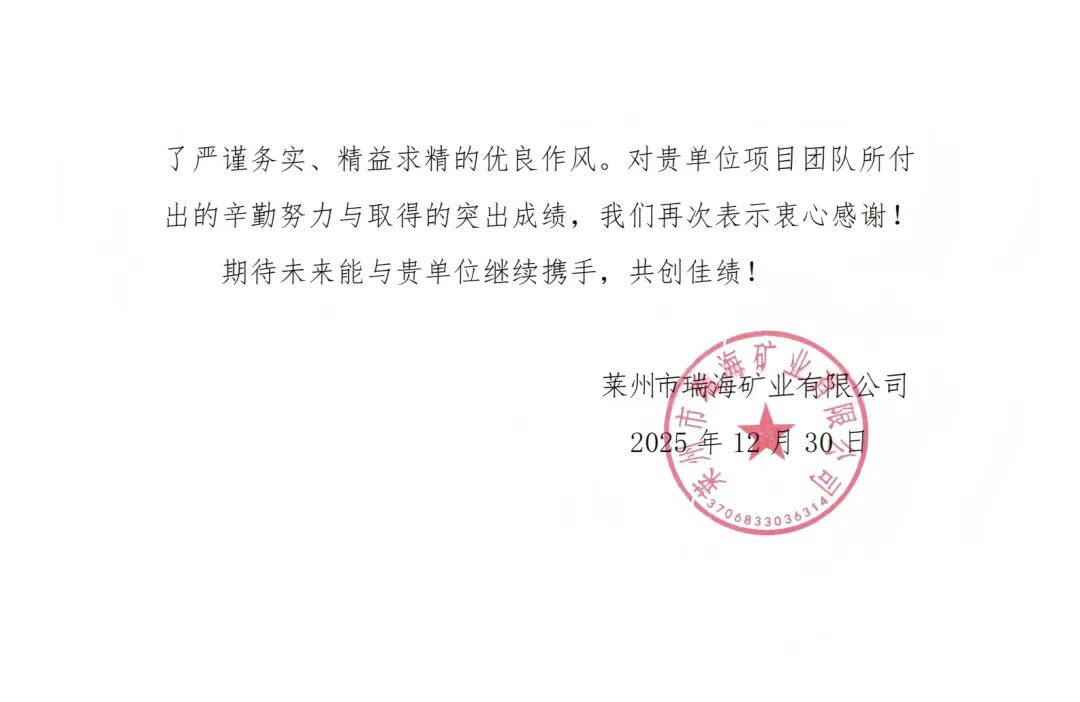 近日,莱州市瑞海矿业有限公司向山东省地矿工程勘察院发来感谢信,对省勘院承建的“莱州市瑞海矿业有限公司地表~-540米段充填钻孔施工及管路安装工程”给予高度评价。