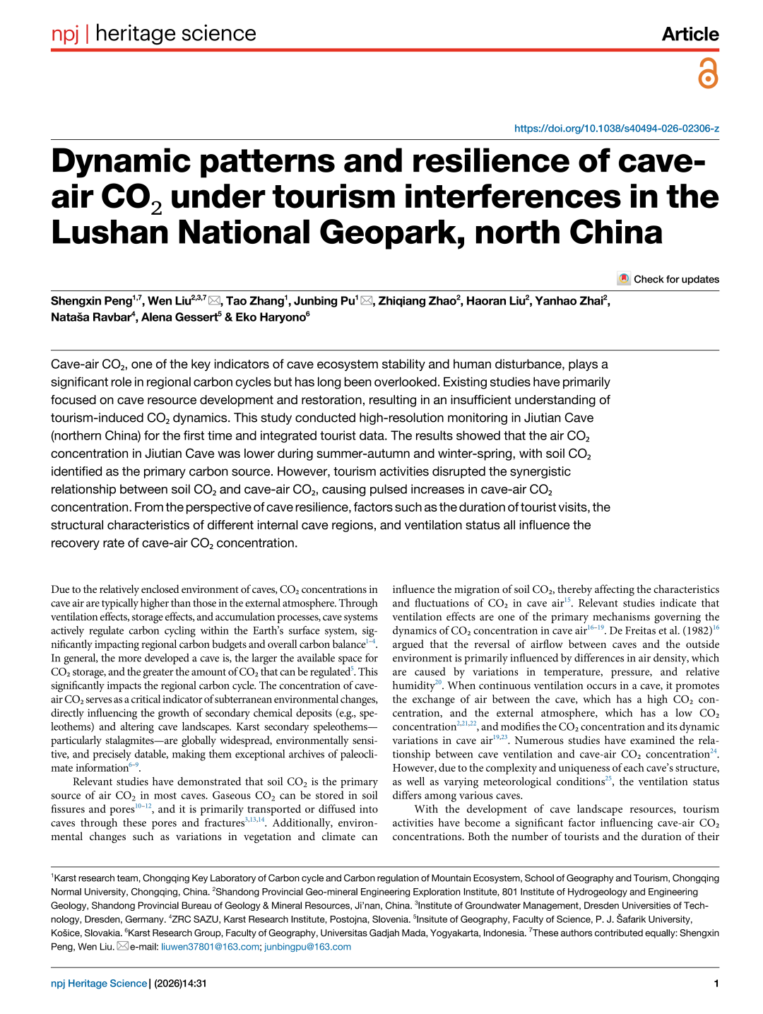 这一建设实践充分体现了省勘院“工程建设与科研监测同步推进”的技术路线优势,完成了从“单一施工”向“运营管理与科学决策支持”的有效跨越。相关成果已于近期以题为《Dynamic patterns and resilience of cave-air CO₂ under tourism interferences in the Lushan National Geopark, north China》的论文,发表在Nature旗下知名期刊《npj Heritage Science》。该期刊属于SCI一区、中科院跨学科一区,在文化遗产与自然保护交叉研究领域享有国际声誉,此举从学术层面充分肯定了省勘院在洞穴环境监测体系建设与应用研究方面的科学价值与技术水准。