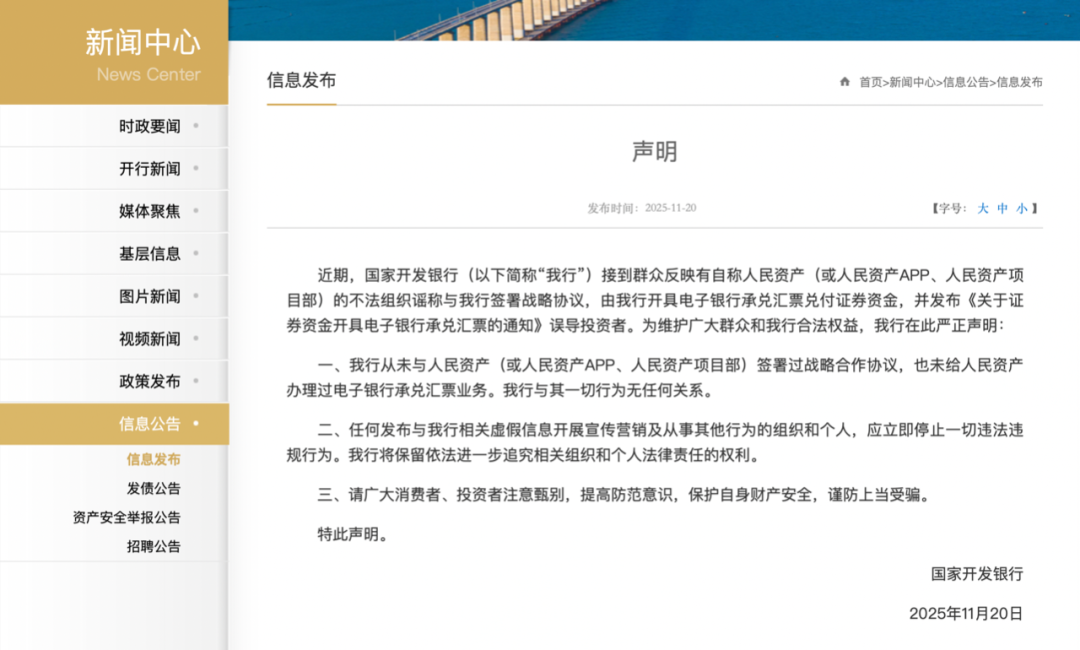后来国开行出来发声明,称从未跟“人民资产”开展业务,与其一切行为无任何关系。