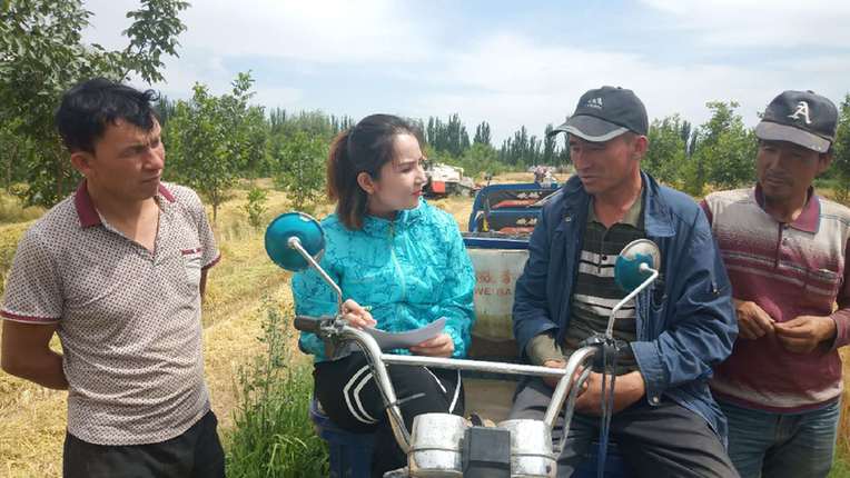 新疆喀什疏勒县融媒体中心阿依帕夏 图拉普采访村民小麦收割