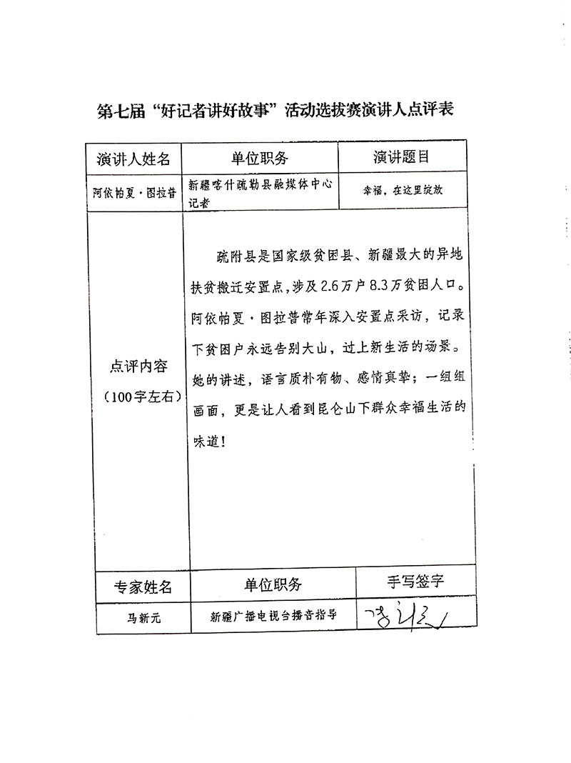 2009年至今在疏勒县融媒体中心工作,从事主持人、记者、编导工作;2009年以来多个新闻采访作品获得自治区、地区评选一二等奖;2017年在自治区“好记者讲好故事”比赛讲述爱心妈妈潘玉莲故事获得一等奖,参加全国比赛,获得优胜选手称号参加全国巡讲;2009年以来在自治区、地区各类演讲比赛中获得一等奖20多次;2016年被评为“感动疏勒”十大人物;喀什地区“十大杰出青年”;