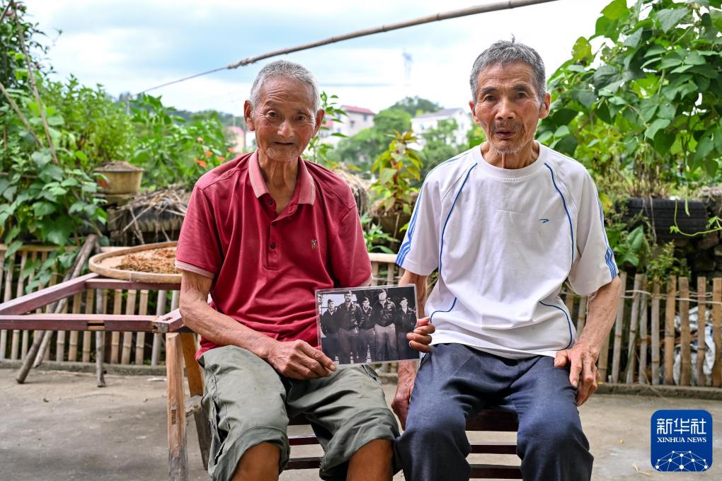 2025年6月18日,毛树居(左)和毛洪根在展示罗斯·威尔德的外孙送给他们的老照片,照片上是杜立特航空队5号机组成员合影,右二为威尔德。新华社记者 张铖 摄
