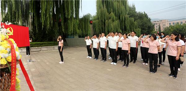 在焦裕禄纪念馆,淄博市文化和旅游局全体党员干部为焦裕禄同志敬献花篮,并重温入党誓词,进行党性体检。